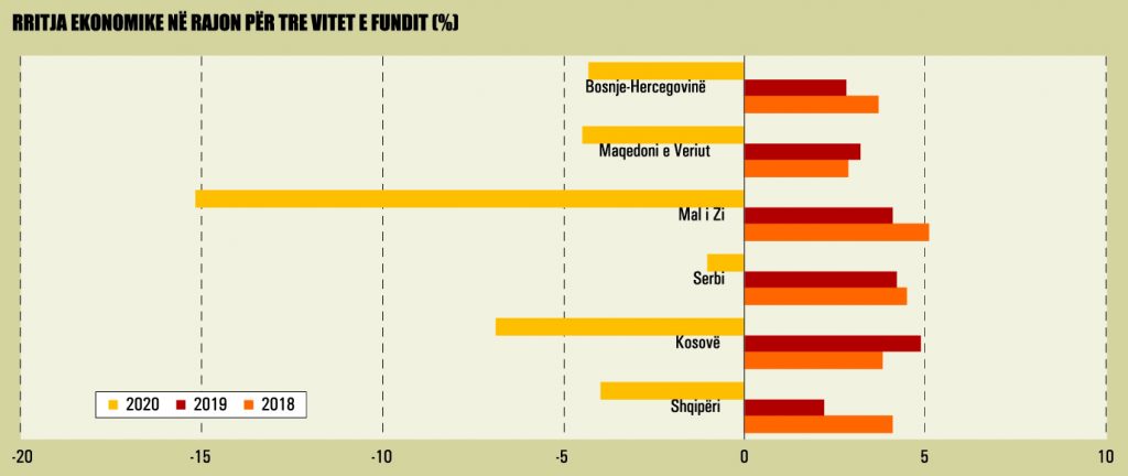 Shqipëria dhe Kosova ishin të vetmet vende të rajonit që iu kthyen rritjes pozitive që në tremujorin e fundit 2020, përkatësisht me 2.4% dhe 0.8%. Serbia dhe Bosnjë-Hercegovina iu kthyen rritjes pozitive në tremujorin e parë 2021, ndërsa Mali i Zi dhe Maqedonia e Veriut ishin ende në territor negativ edhe në këtë periudhë.