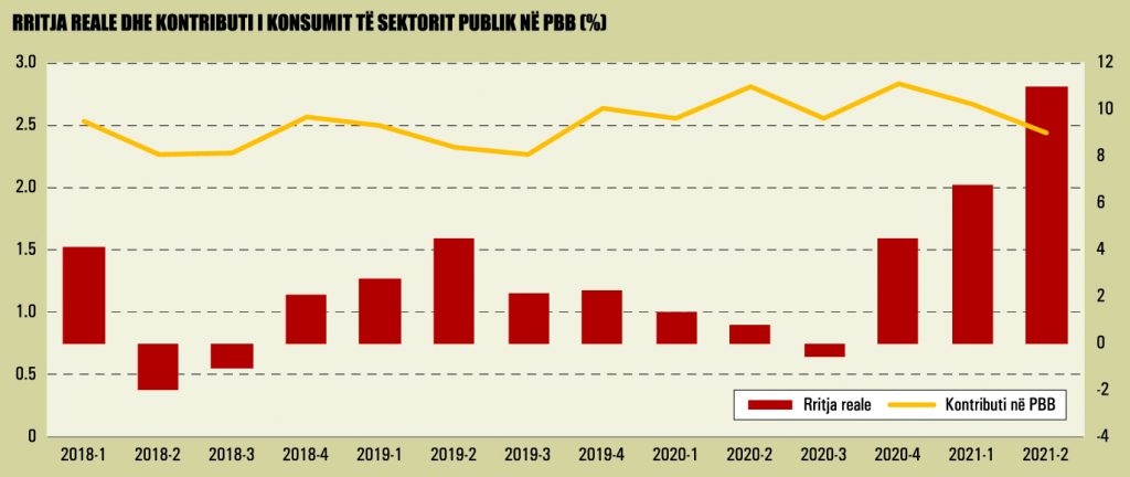 Një nga indikatorët e ndikimit direkt të qeverisë në ekonomi është konsumi final i administratës publike në strukturën e Prodhimit të Brendshëm Bruto, sipas metodës së shpenzimeve. Të dhënat e INSTAT tregojnë se, vitin e kaluar, konsumi i administratës publike pati një peshë relative në rritje në ekonomi. Nëse gjatë vitit 2019, pesha specifike e konsumit të administratës publike në PBB kishte qenë mesatarisht 2.43%, për vitin 2020, pesha e konsumit të sektorit publik u rrit në rreth 2.69% të PBB-së.
