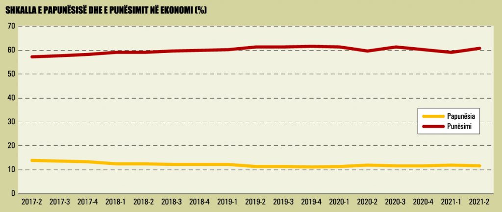 Pandemia dha një efekt të ndjeshëm edhe në tregun e punës, shoqëruar me rënie të punësimit dhe rritje të papunësisë. Nëse rritja ekonomike është rimëkëmbur dhe në tremujorin e dytë të vitit, prodhimi arriti nivelet e parakrizës, punësimi në ekonomi ende nuk është rimëkëmbur plotësisht. Sipas INSTAT, në tremujorin e dytë të këtij viti, shkalla e papunësisë ishte 11.6%, nga 11.2% në tremujorin e fundit 2019, para shtrirjes së efekteve të pandemisë. Shkalla zyrtare e punësimit raportohet në tremujorin II 2021 në nivelin 60.7%, nga 61.6% në tremujorin IV 2019.