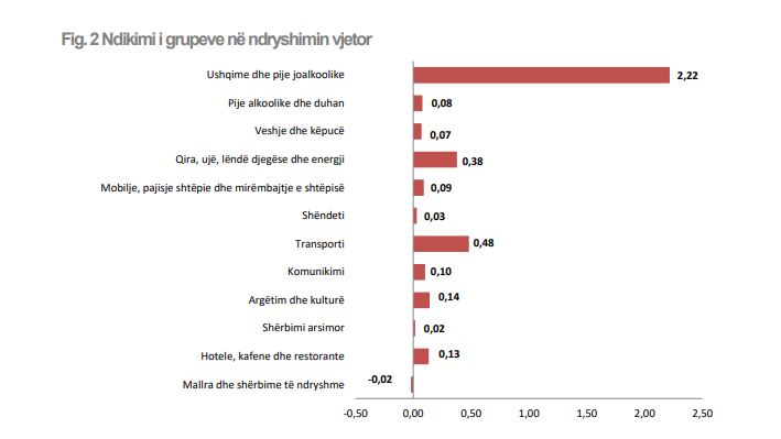 Sipas INSTAT rritjen më të madhe kanë pësuar ushqimet dhe pijet jo-alkoolike me 2.2%. Krahasuar me muajin nëntor 2021, çmimet e grupit “Ushqime dhe pije joalkoolike” u rritën me 1.9 %, pasuar nga grupet “Hotele, kafene dhe restorante” me 0.9 %.