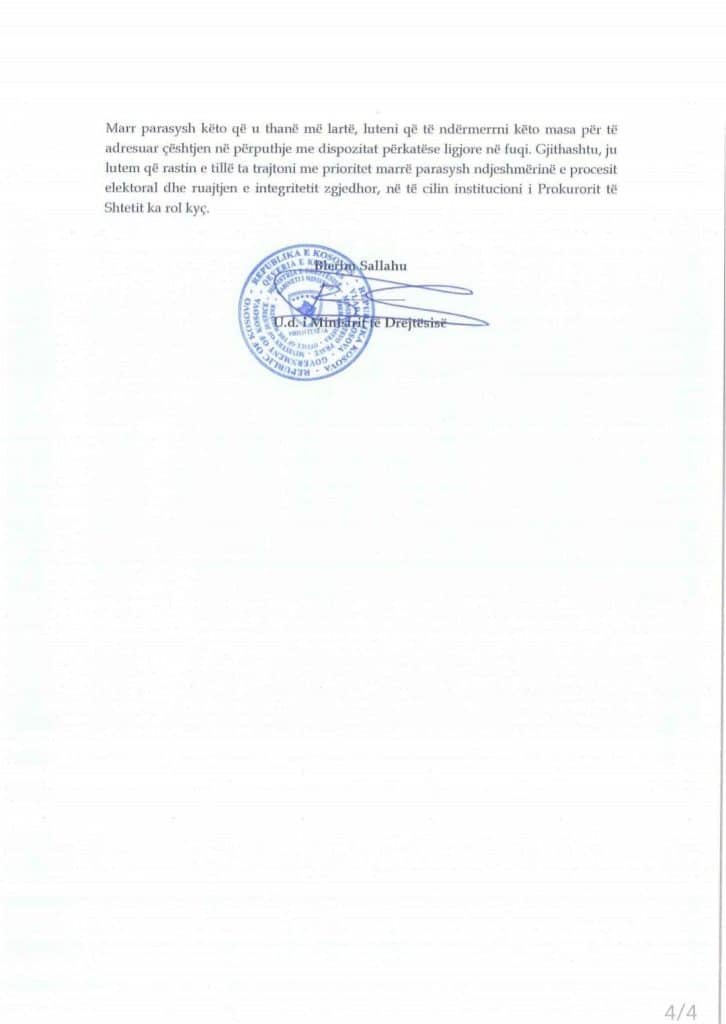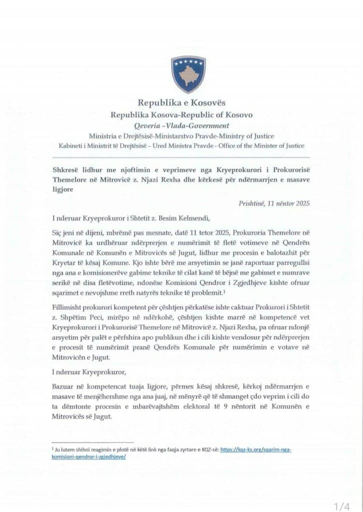 Ministri në detyrë i Drejtësisë i Kosovës, Blerim Sallahu, ka thënë se sapo ka nisur shkresën drejtuar U.D Kryeprokurorit të Shtetit, z. Besim Kelmendi, nga i cili ka kërkuar që në përputhje me legjislacionin në fuqi, ndaj Kryeprokurorit të Prokurorisë Themelore në Mitrovicë, z. Njazi Rexha, të ndërmerrën këto masat që i numëroi si më poshtë: