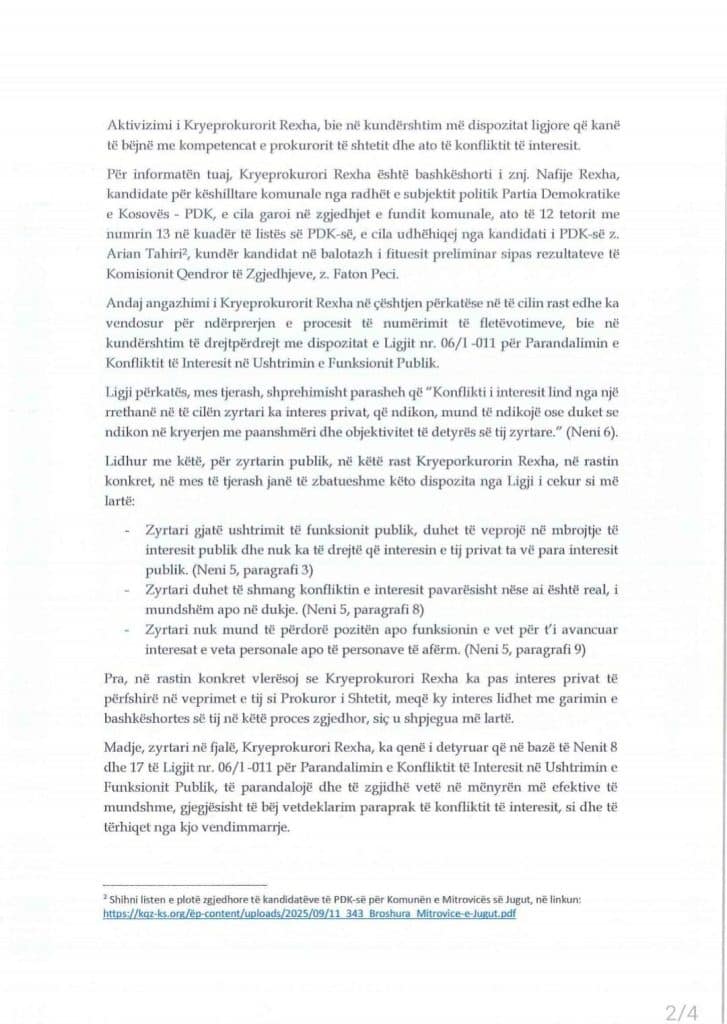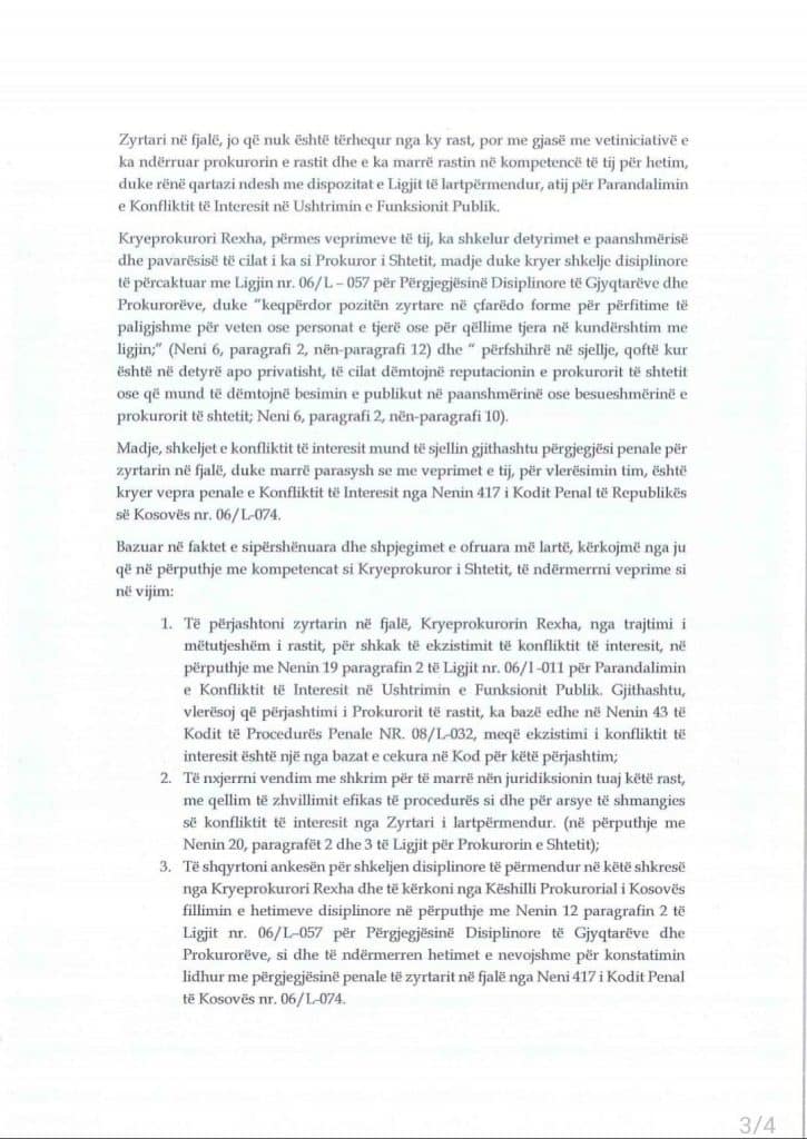“1. Të përjashtoni zyrtarin në fjalë, Kryeprokurorin Rexha, nga trajtimi i mëtutjeshëm i rastit, për shkak të ekzistimit të konfliktit të interesit, në përputhje me Nenin 19 paragrafin 2 të Ligjit nr. 06/l -011 për Parandalimin e Konfliktit të Interesit në Ushtrimin e Funksionit Publik. Gjithashtu, vlerësoj që përjashtimi i Prokurorit të rastit, ka bazë edhe në Nenin 43 të Kodit të Procedurës Penale NR. 08/L-032, meqë ekzistimi i konfliktit të interesit është një nga bazat e cekura në Kod për këtë përjashtim;