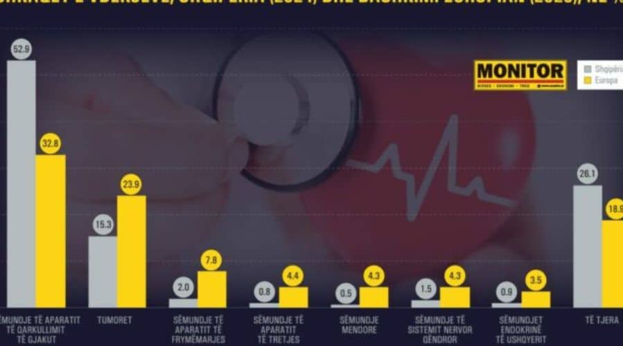 Të dhënat krahasuese nga INSTAT dhe Eurostat tregojnë se 52.9% e vdekjeve në Shqipëri lidhen me sëmundjet e aparatit të qarkullimit të gjakut, ndërsa në Bashkimin Europian kjo kategori përbën 32.8% të totalit të vdekjeve.