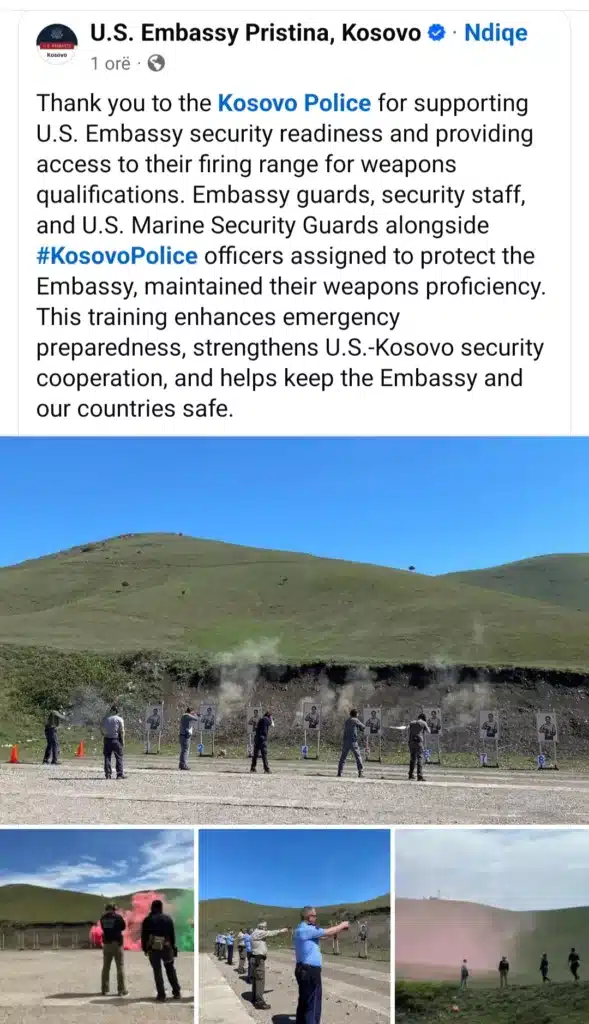Përmes një postimi zyrtar, Ambasada amerikane ka bërë të ditur se rojet e ambasadës, stafi i sigurisë dhe pjesëtarët e Gardës Detare të SHBA-së, së bashku me oficerët e Policisë së Kosovës që janë të caktuar për mbrojtjen e Ambasadës, kanë zhvilluar trajnim për ruajtjen e aftësive profesionale në përdorimin e armëve.