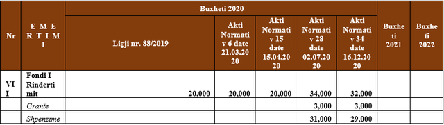 Sipas pasqyrimit në tabelat shoqëruese (tabela 4-treguesit fiskalë të buxhetit të konsoliduar e ligjit nr.88/2019 “Për buxhetin e vitit 2020”) të këtij ligji, janë parashikuar fonde vetëm për vitin 2020 dhe nuk janë parashikuar fonde për vitet 2021 dhe 2022 dhe buxheti i parashikuar për fondin e rindërtimit për vitin 2020 sipas ndryshimeve me akte normative paraqitet në tabelën e mëposhtme: