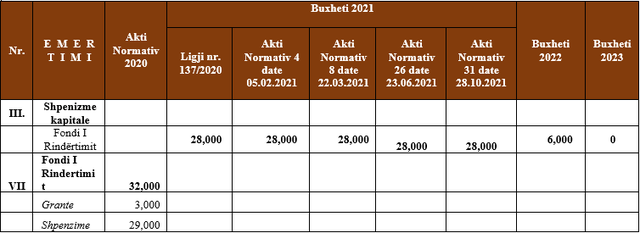 Vlera e alokuar me VKM në shumën 99,666 lekë, duke marrë parasysh nivelin e realizimit të vitit 2020 në shumën 16,591 milion lekë, nuk është shpërndarë në vitet 2021-2023 pasi diferenca prej 83,075 milion lekë (99,666 milion lekë – 16,591 milion lekë) është më e madhe se vlera e buxhetuar për 2021-2023 prej 34,000 milion lekë.
