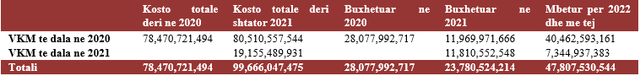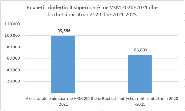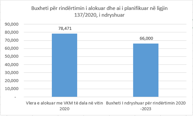 Në total, sipas VKM-ve të përditësuara deri në 30.09.2021, që nga 01.01.2020 fondi i rindërtimi i shpërndarë me VKM vlerësohet në shumën 99,666 milion lekë. Vlera e buxhetuar në 2020, sikurse u përmend më sipër është 28,078 milion lekë, ajo e alokuar në 2021 është 23,781 milion lekë (për VKM të 2020 dhe 2021), duke sjellë që vlera e mbetur për t’u financuar për vitin 2022 e në vijim të paraqitet si diferencë në shumën 47,808 milion lekë.