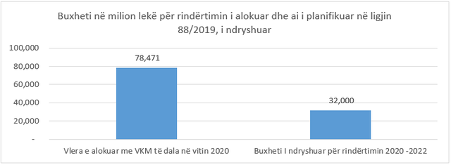 Në dokumentacionin e projekt ligjit “Për miratimin e buxhetit faktik 2020”, në tabelën “Tabela analitike e perdorimit të Fondit të Rindërtimit 2020” paraqitet lista e VKM-ve të dala gjatë vitit për përdorimin e fondit të rindërtimit, që përfshijnë një vlerë të alokuar prej 28,079 milion lekë. Nga analiza e këtyre VKM, për të cilën është krijuar databaza me të gjitha VKM të dala vetëm për vitin 2020, rezulton se kosto totale e parashikuar për realizimin e fondit është 78,471 milion lekë, nga të cilat vetëm vlera e alokuar për vitin 2020 është 28,079 milion lekë. Pjesa tjetër e pa mbuluar me fonde parashikohet në vitet e ardhshme buxhetore ndërkohë që sipas tabelës 4 të ligjit nr. 88/2019 “Për buxhetin e vitit 2020” nuk janë parashikuar fonde për vitet e ardhshme buxhetore.