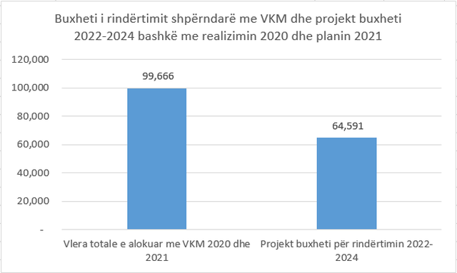 Krahasimi i vlerës së shpërndarë në total me VKM për rindërtimin sipas VKM të përditësuara deri në 30.09.2021 me buxhetin e planifikuar në ligje te buxhetit vjetor për periudhën 3 vjeçare sipas së cilës miratohet buxheti 2021-2023 dhe me vlerat e parashikuara në projekt buxhetin 2022-2024, paraqitet grafikisht si më poshtë:
