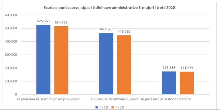 Të dhënat nga INSTAT, që u referohen të dhënave administrative (të punësuarit me pagë të deklaruar zyrtarisht) tregojnë se, numri i të punësuarve ka rënë me 30 mijë persona gjatë 9 muajve të 2020-s, në krahasim me fundin e 2019-s.