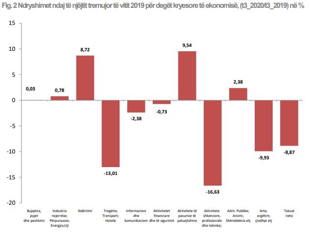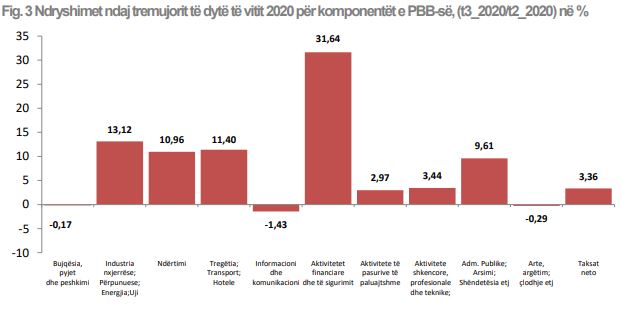 Sipas INSTAT, në rënien e tremujorit të tretë, Negativisht kontribuuan aktivitetet: Tregti, Transport, Akomodim dhe Shërbim ushqimor me -2,45 pikë përqindje, Aktivitete profesionale dhe Shërbime administrative me -1,20 pikë përqindje, Arte, argëtim dhe çlodhje; aktivitete të tjera shërbimi me -0,21 pikë përqindje, Informacioni dhe Komunikacioni me -0,07 pikë përqindje, Aktivitete Financiare dhe të Sigurimit me -0,03 pikë përqindje.