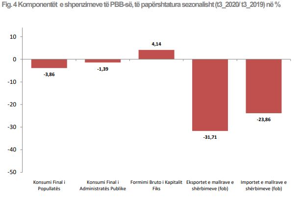 Të dhënat e publikuara nga INSTAT, tregojnë se Produkti i Brendshëm Bruto (P.B.B), i ndikuar nga situata e krijuar nga COVID-19, në tremujorin e tretë të vitit 2020 vlerësohet me rënie prej 3,47%, kundrejt tremujorit të tretë të vitit 2019. Në tremujorin e dytë rënia ishte 10.2% dhe në të parin -2.52%.