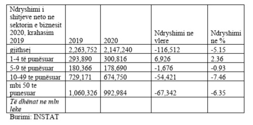 Në 2020-n, të ardhurat nga shitjet të bizneseve shënuan rënie me 116 miliardë (932 milionë euro) në krahasim me vitin 2019 raportoi INSTAT në të dhënat paraprake të Anketës Strukturorë të Ndërmarrjeve. Xhiroja totale e bizneseve arriti në 18,4 miliardë euro me tkurrje 5.1 për qind në krahasim me vitin 2019.