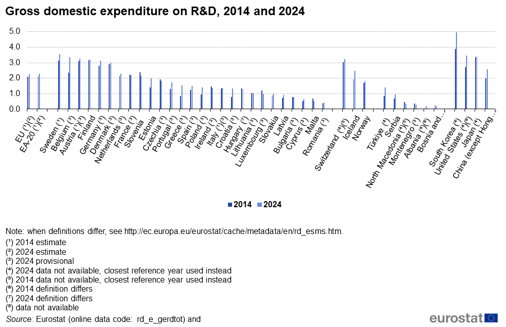Sipas Eurostat, në vitin 2024, 6 vende të BE-së regjistruan një intensitet të shpenzimeve për R&D të barabartë ose më të lartë se 3%, objektivi i BE-së i vendosur nga Këshilli Europian. Intensiteti më i lartë i R&D-së u regjistrua në Suedi (3.6%), Belgjikë (3.4%), Austri (3.3%) dhe Finlandë (3.2%), të ndjekura nga Gjermania (3.1%) dhe Danimarka (3.0%).