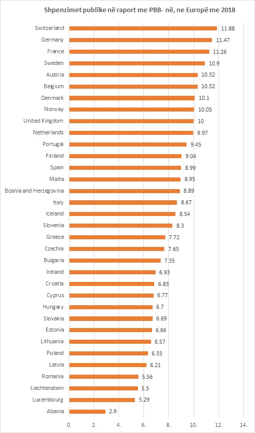 Nga të dhënat shihet se, Shqipëria renditet e fundit në Europë sa u takon shpenzimeve për shëndetësinë, madje me një diferencë shumë të madhe edhe nga vendi i parafundit. Në vitin 2018, Shqipëria akordoi 2.9% të PBB-së si fonde për shëndetësinë. Të dhënat tregojnë se Shqipëria shpenzon një të katërtën e mesatares europiane për këtë sektor.