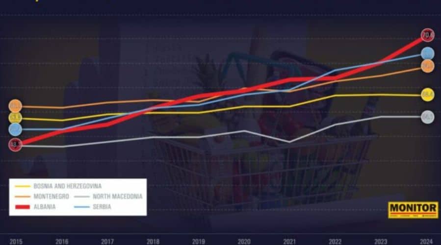 Një dekadë më parë, çmimet në vend ishin sa gjysma e mesatares së BE-së, ndërsa në 2024-n ishin sa dy të tretat e BE-së. Madje çmimet e ushqimeve për herë të parë kapën mesataren e Bashkimit Europian (101%) dhe ishin më të shtrenjtat në rajon.