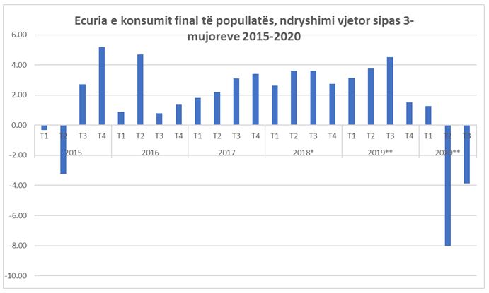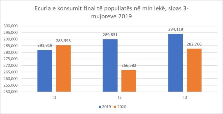 Nga të dhënat shihet së rënia ma e madhe ishte në tremujorin e dytë të vitit, ku konsumi ishte 23 miliardë lekë (189 mln euro) më i ulët se e njëjta periudhe e një viti më parë. Kjo periudhë përkon me masat e ashpra të karantinës së parë ku u pezullua tërësisht lëvizja dhe aktivitetet i njësive tregtare përgjatë prillit dhe 20 ditëshit të parë të majit.