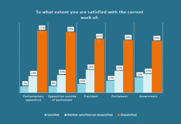 Sipas sondazhit, 69% e shqiptarëve nuk janë të kënaqur nga qeveria, 61% janë të pakënaqur nga presidenti dhe 70% janë të pakënaqur nga opozita, qoftë ajo parlamentare ose jashtëparlamentare.