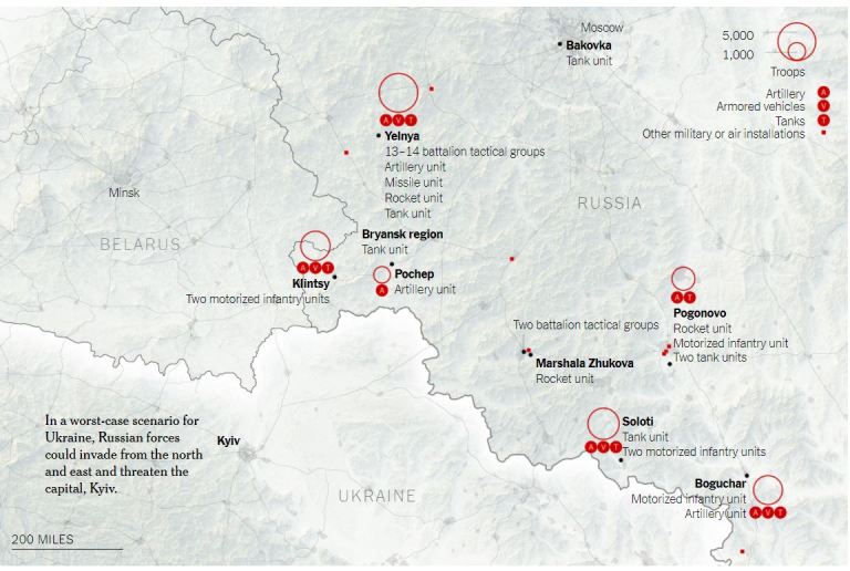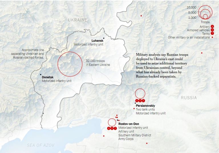 Një grumbullim i forcave ruse pranë kufirit me Ukrainën ka ngritur shqetësimin midis zyrtarëve perëndimorë dhe ukrainas se Kremlini mund të përgatitet për një veprim të rëndësishëm ushtarak, ndoshta një pushtim. Kjo hartë, e përpiluar nga The New York Times, tregon trupat, tanket dhe artilerinë e rëndë që lëvizin në pozicione që kërcënojnë të zgjerojnë konfliktin në lindje të Ukrainës, si dhe të hapin potencialisht një front të ri në kufirin verior të Ukrainës, më afër kryeqytetit, Kiev.