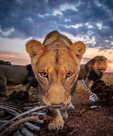 Ai ka mundur që të fiksojë në syrin e kameras momentin madhështor kur një luan mashkull qëndron me krenari në majë të një kodre mbushur me eshtra kufomash, ndërsa shikimin e ka drejt qiellit.