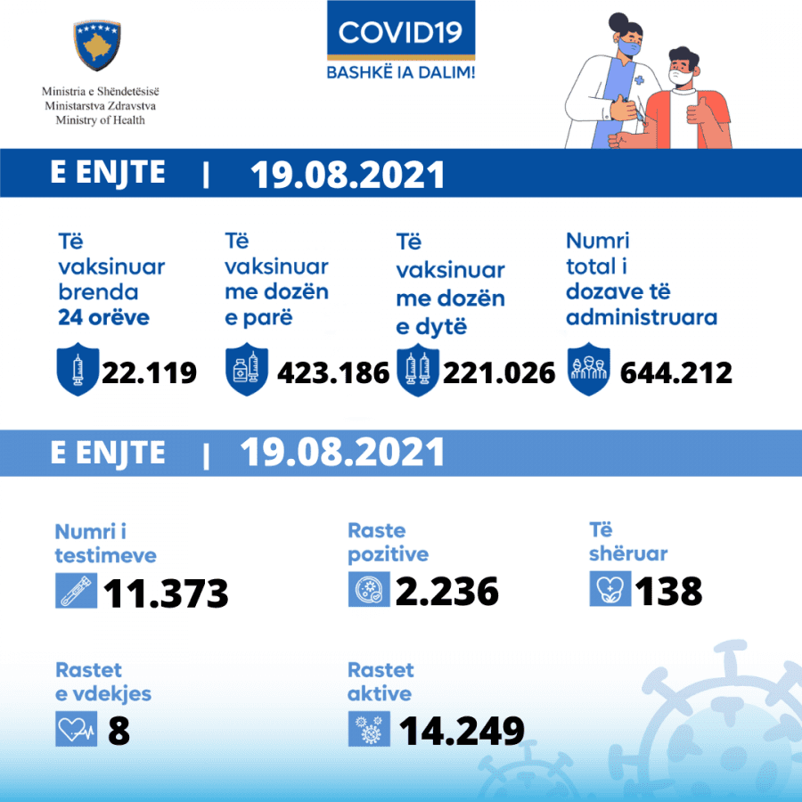 E enjtja e 19 gushtit ka regjistruar dy rekorde lidhur me COVID-19. Janë regjistruar rekord rastesh e janë kryer rekord vaksinimesh. 2236 persona kanë rezultuar pozitivë, ndërsa janë kryer 22 mijë e 213 vaksinime.