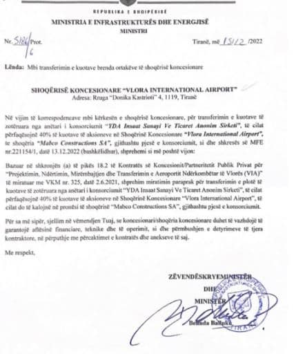 Dhe pikërisht këtu shfaqet fuqishëm roli i errët i Belinda Ballukut. Me fuqinë e ministres që përfaqëson Autoritetin Kontraktor ajo s’duhej ta miratonte këtë kalim aksionesh. Tenderi ishte fituar vetëm falë prezencës së turqve që kishin edhe garancinë financiare edhe mbi të gjitha atë teknike për ndërtim aeroportesh. Nëse ata largoheshin gara quhej e pavlefshme. Por në Dhjetor të vitit 2022, Belinda Balluku e ka miratuar këtë shitje aksionesh që është bërë edhe molla aktuale e sherrit mes dy aksionerëve të mbetur. Gazetarja Ola Xama ka publikuar dokumentin që mban firmën e Ballukut. Xama shkruan: “Edhe miratimi për shitjen e aksioneve nga turqit e YDA te kompania Mabco Construction është bërë në shkelje. Kjo duket qartë që te vendimi për miratimin e shitjes që ka bërë ministrja e Infrastrukturës dhe Energjisë. Në paragrafin e fundit të shkresës thuhet se “koncesionari duhet të vazhdojë të garantojë aftësinë financiare, teknike dhe të operimit”. Pra, miratimi është bërë pa u garantuar vazhdimi i aftësisë teknike dhe financiare”! Po përse, pas organizimit të një tenderi fallco Balluku e ka pranuar edhe këtë shkelje të re flagrante? Mos aksionet e lëna nga turqit ishin destinuar për dikën tjetër? Përgjigjen e jep në një shkrim të tij (shiko linkun poshtë) gazetari Klodian Tomorri: “Problemi tani është se Behgjet Pacolli u bë aq tahmaqar saqë nuk po lëshon pjesën që pati rënë dakord kur i patën dhënë tenderin”.