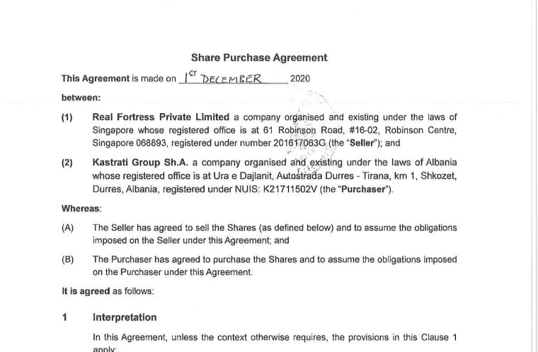 Marrëveshja mes “Kastrati Group” dhe “Real Fortress Private Limited” është nënshkruar më 1 dhjetor 2020 dhe është regjistruar në Qendrën Kombëtare të Biznesit më 18 dhjetor.