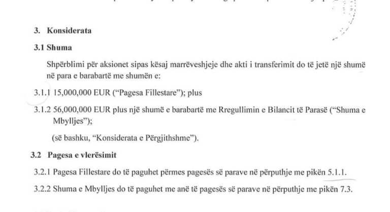 Sipas kontratës, grupi Kastrati do të paguajë gjithsej 71 milionë euro përmes dy pagesave. Sipas referimit në kontratë: