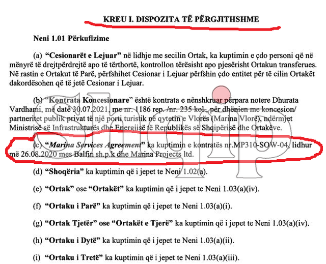 Përmbajtja e kontratës është e klasifikuar, por ajo kushtëzon marrëdhënien mes dy ortakëve të koncesionit, ortakut të parë, që statuti i koncesionarit përcakton kompaninë “Marina di Valona” dhe ortakut të dytë, që është kompania britanike, “Marina Projects” LTD.