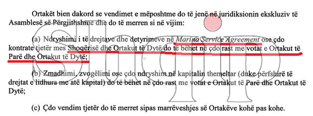 Në nenin 3.3 të statutit të themelimit ku flitet për “vendimmarrjet specifike të asamblesë së ortakëve thuhet se: “Ndryshimi i të drejtave dhe detyrimeve në Marina Service Agreement, ose çdo kontratë tjetër mes shoqërisë dhe ortakut të dytë do të bëhet në çdo rast me votat e ortakut të parë dhe ortakut të dytë”.