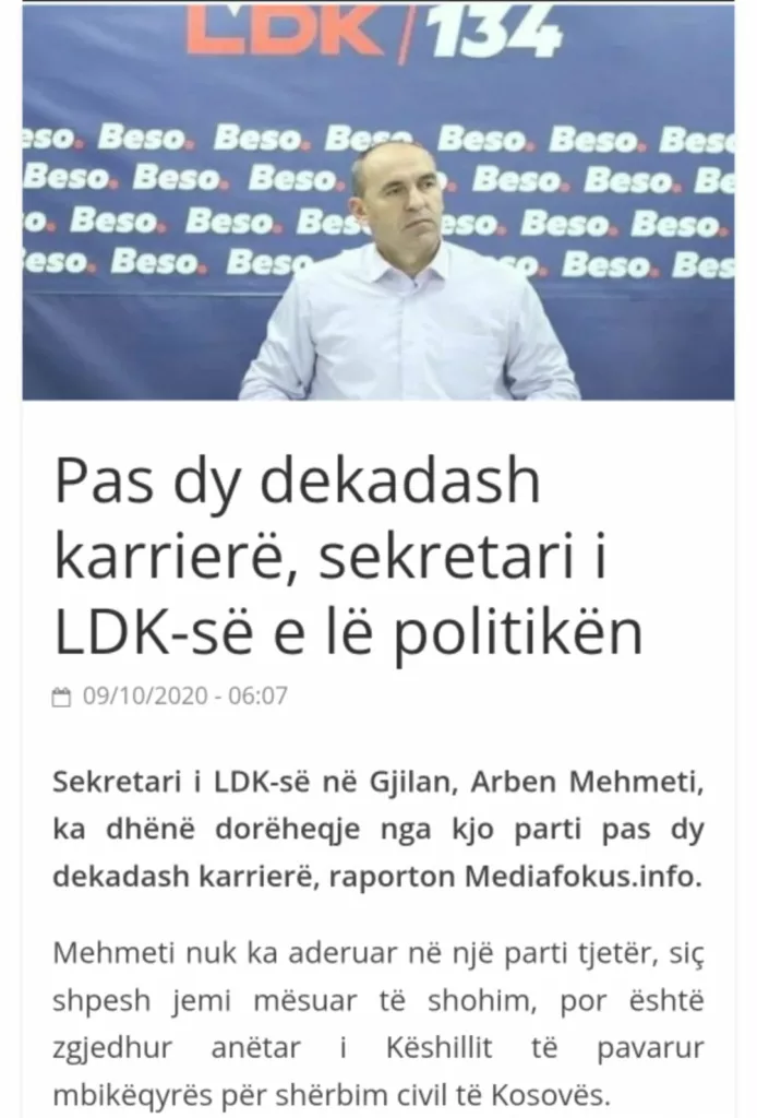 Arben Mehemeti, i cili është kryetar i KPMSHC-së, por edhe kryetar i kolegjit në rastin e Lendita Rashitit deri në momentin e zgjedhjes si anëtar i KPMSHC-së, kishte qenë aktivist i Lidhjes Demokratike të Kosovës duke mbajtur pozita të ndryshme në këtë parti. Ai kishte qenë sekretar i degës së LDK-së në Gjilan dhe në momentin kur ishte zgjedhur kishte dhënë dorëheqje nga LDK-ja, këtë vetë e kishte pranuar në një deklaratë publike.