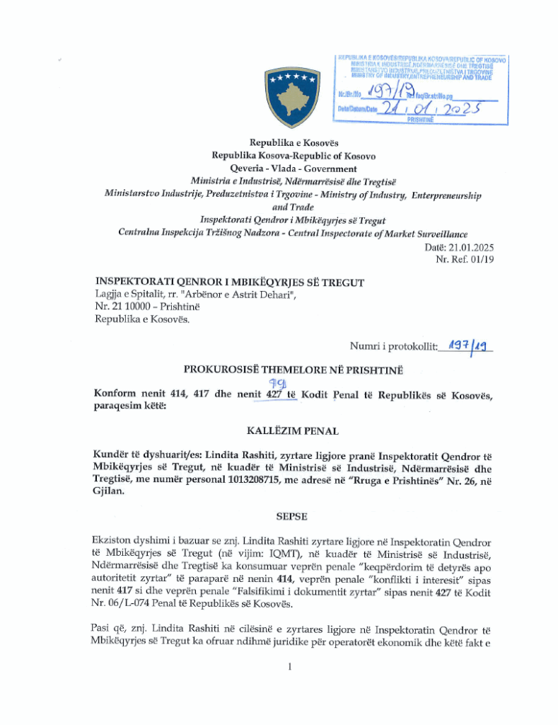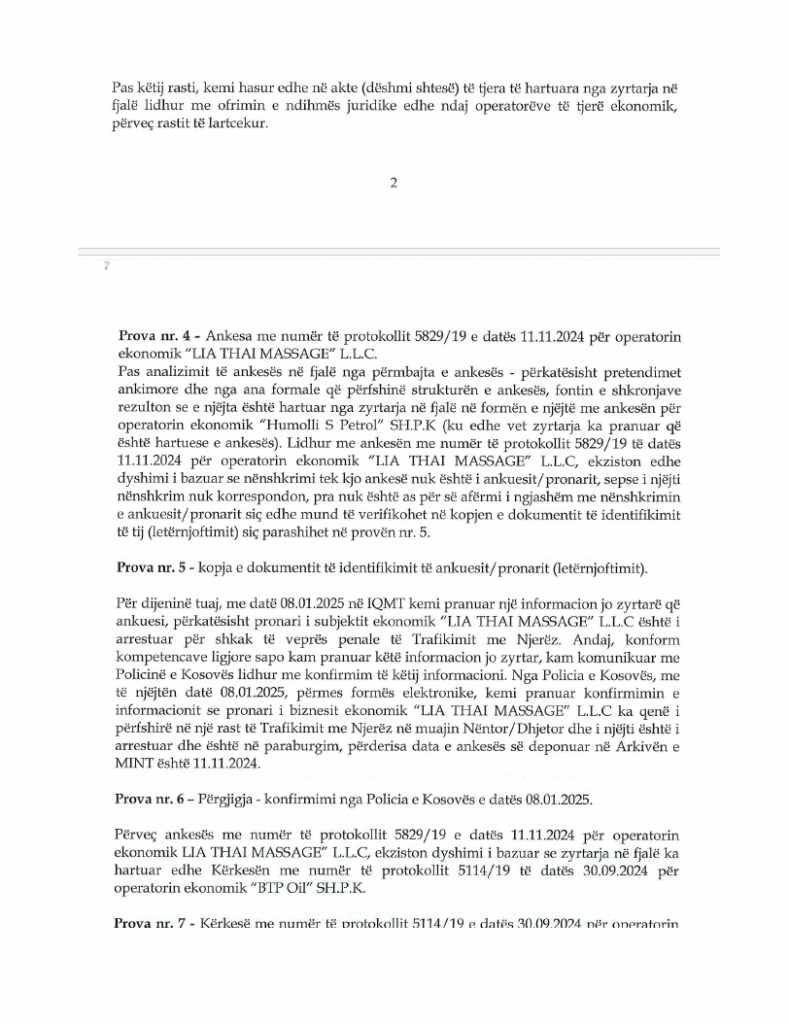 “Lidhur me ankesën me numër të protokollit 5829/19, të datës 11.11.2024, për operatorin ekonomik “LIA THAI MASSAGE” L.L.C, ekziston edhe dyshimi i bazuar se nënshkrimi tek kjo ankesë nuk është i ankuesit/pronarit, sepse i njëjti nënshkrim nuk korrespondon, pra nuk është as për së afërmi i ngjashëm me nënshkrimin e ankuesit/pronarit ,siç edhe mund të verifikohet në kopjen e dokumentit të identifikimit të tij. Me datë 08.01.2025 në IQMT kemi pranuar një informacion jozyrtar, që ankuesi, përkatësisht pronari i subjektit ekonomik “LIA THAI MASSAGE” L.L.C, është i arrestuar për shkak të veprës penale të Trafikimit me Njerëz. Andaj, konform kompetencave ligjore sapo kam pranuar këtë informacion jozyrtar, kam komunikuar me Policinë e Kosovës lidhur me konfirmim të këtij informacioni. Nga Policia e Kosovës, me të njëjtën datë 08.01.2025, përmes formës elektronike, kemi pranuar konfirmimin e informacionit se pronari i biznesit ekonomik “LIA THAI MASSAGE” L.L.C ka qenë i përfshirë në një rast të Trafikimit me Njerëz në muajt nëntor/dhjetor dhe i njëjti është i arrestuar dhe është në paraburgim, përderisa data e ankesës së deponuar në Arkivën e MINT është 11.11.2024” , thuhet ndër të tjera në kallximin penal që është dorëzuar në Prokurorinë Themelore në Prishtinë ndaj znj. Lendita Rashiti.