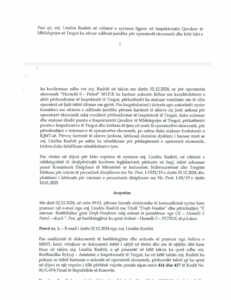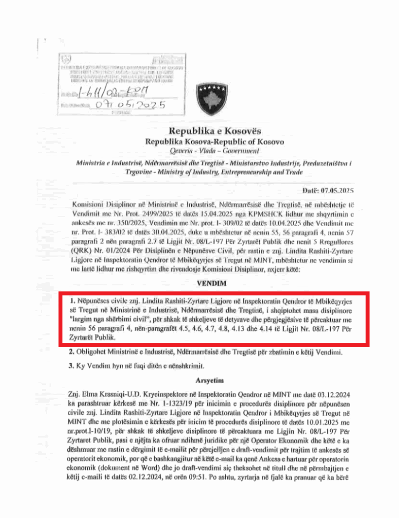 “Nëpunëses civile, znj. Lindita Rashiti – zyrtare ligjore në Inspektoratin Qendror të Mbikëqyrjes së Tregut në Ministrinë e Industrisë, Ndërmarrësisë dhe Tregtisë, i shqiptohet masa disiplinore “largim nga shërbimi civil”, për shkak të shkeljeve të detyrave dhe përgjegjësive të përcaktuar me nenin 56 paragrafi 4, nën-paragrafet 4.5, 4.6, 4.7, 4.8, 4.13 dhe 4.14 të Ligjit Nr. 08/L-197 Për Zyrtarët Publikë”, thuhet në pikën e parë të këtij vendimi.