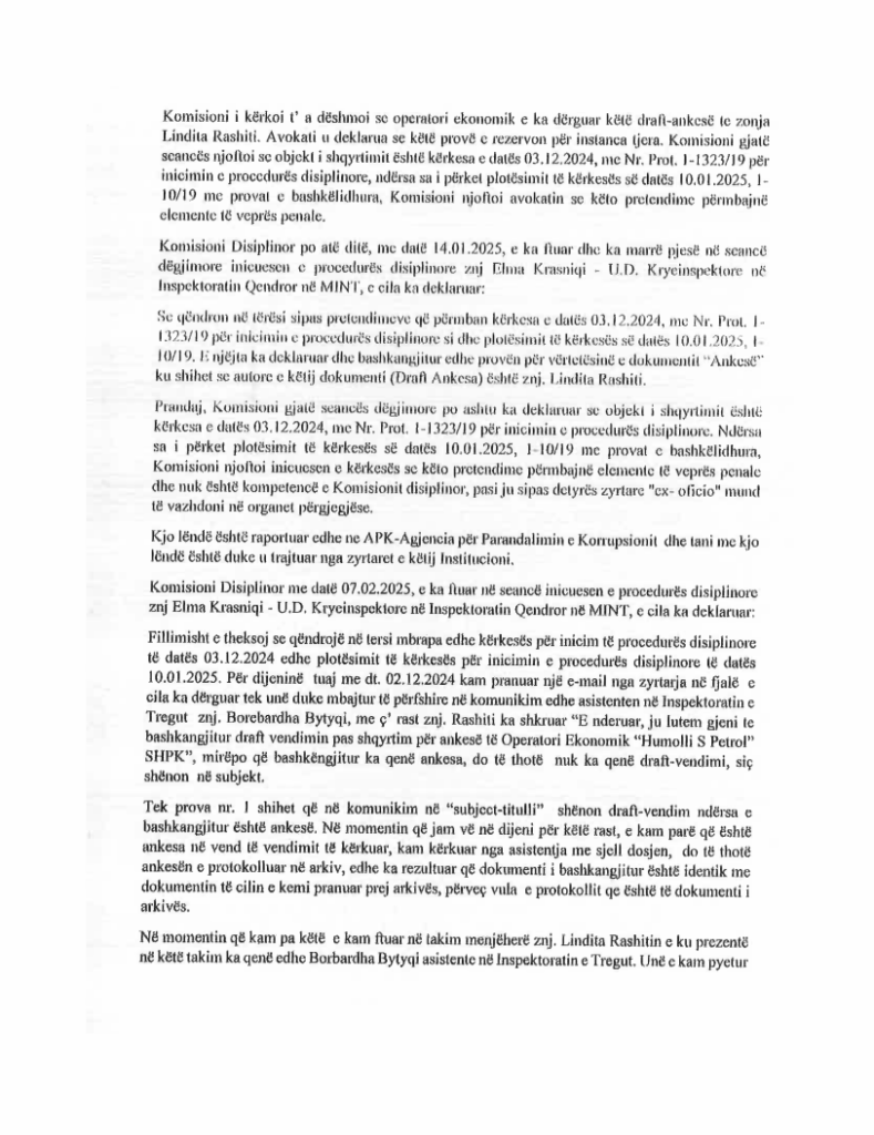 Me të marrë këtë shkresë zyrtare, U.D. kryeinspektorja Elma Krasniqi e kishte kuptuar se zyrtarja ligjore ishte vetëzbuluar duke konkluduar se vetë ajo ua kishte shkruar ankesat e operatorëve ekonomikë. Menjëherë të nesërmen, më datë 3 dhjetor 2024, kryeinspektorja kishte parashtruar kërkesë për inicimin e procedurës disiplinore për nëpunësen civile znj. Lindita Rashiti – zyrtare Ligjore në Inspektoratin Qendror të Mbikëqyrjes së Tregut.