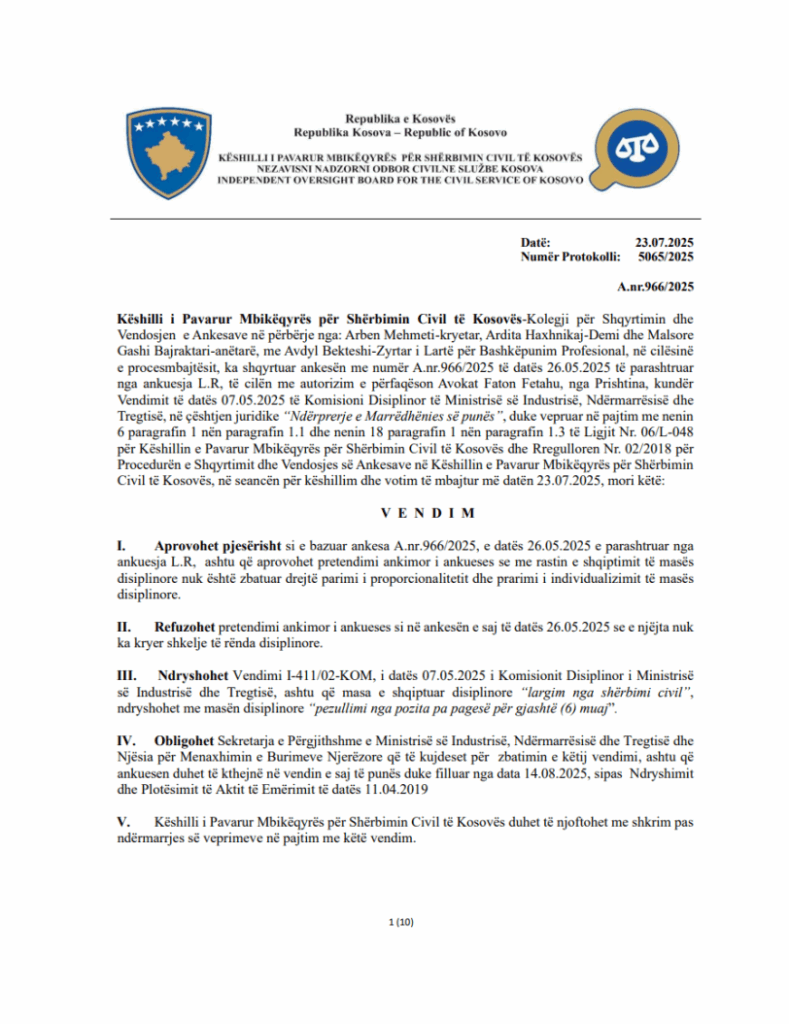 “Aprovohet pjesërisht si e bazuar ankesa A.nr.966/2025, e datës 26.05.2025 e parashtruar nga ankuesja Lindita Rashiti, ashtu që aprovohet pretendimi ankimor i ankueses se me rastin e shqiptimit të masës disiplinore nuk është zbatuar drejtë parimi i proporcionalitetit dhe prarimi i individualizimit të masës disiplinore”, thuhet në pikën e parë të këtij vendimi