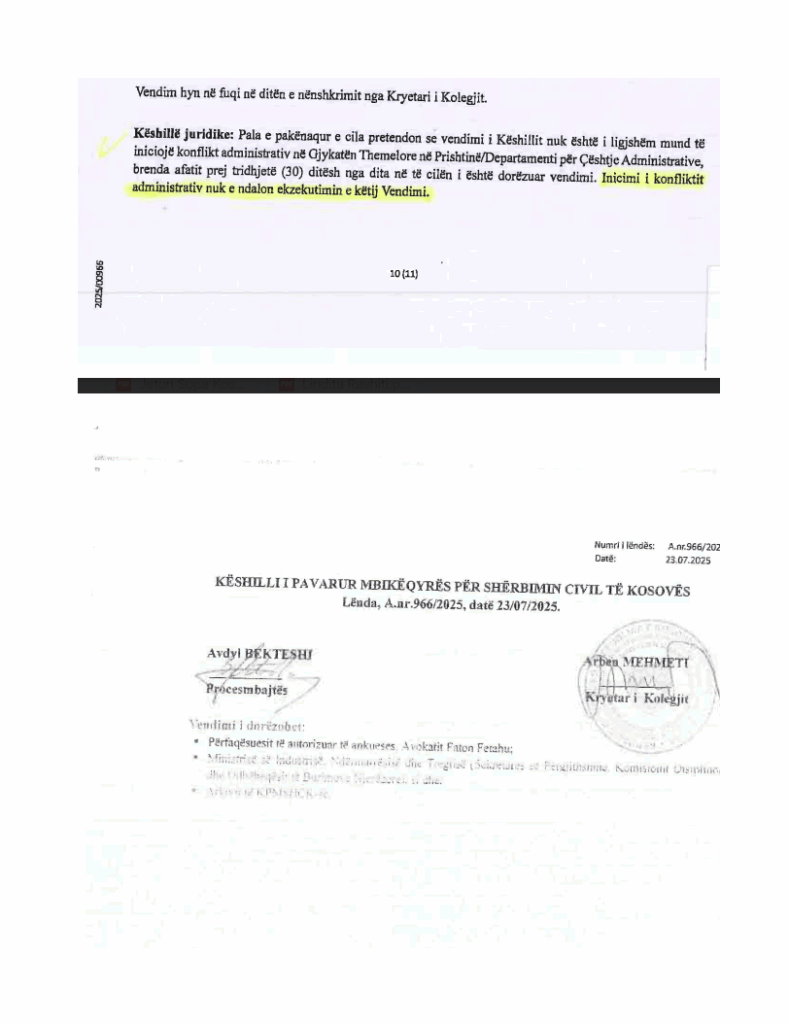 Ndërsa e ka obliguar sekretarin e Përgjithshëm në MINT dhe Njësinë për Menaxhimin e Burimeve Njerëzore që të kujdeset për zbatimin e këtij vendimi, ashtu që ankuesen duhet ta kthejnë në vendin e saj të punës duke filluar nga data 14.08.2025. Pra, ka më shumë se dy javë që znj. Rashiti është kthyer në vendin e saj të punës, pas një vendimi të paprecedan të KMSHC-së madje duke mos e ndaluar ekzekutimin e këtij vendimi edhe pala e dërgon në gjykatë!