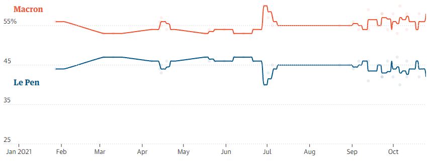 Agjensitë e sodazheve në Francë, i pyesin njerëzit edhe se kë do të votonin hipotetikisht në raundin e dytë. Për arsye të qarta, ata e përqendrojnë votën në atë që duket si përsëritje e skenarit të vitit 2017, pra një votë Macron-Le Pen.