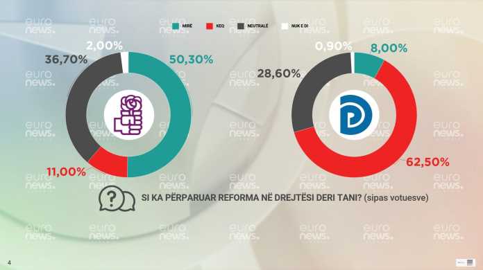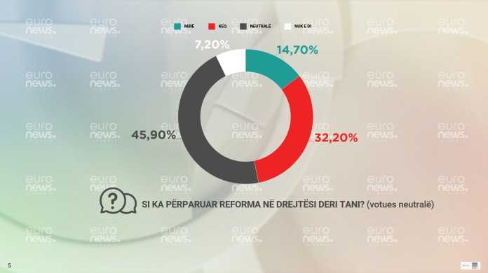 Më shumë shqiptarë mendojnë që reforma në drejtësi ka ecur keq se sa mirë, sipas një vrojtimi të Euronews Albania. Një në katër persona (25,1%) mendojnë se reforma ka shkuar keq dhe një në dhjetë (11%) mendojnë se ajo ka shkuar shumë keq.