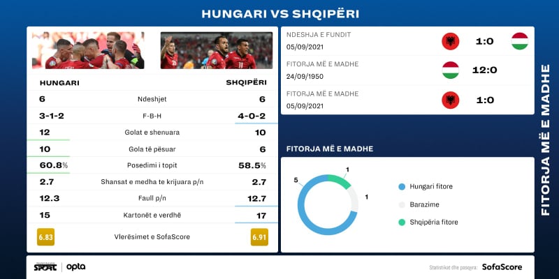 Faqja e specializuar e statistikave “Sofa Score” ka bërë publike bilancet e Hungarisë dhe Shqipërisë ku ndeshjen e fundit mes tyre, Shqipëria fitoi 1-0 në stadiumin “Elbasan Arena” falë golit të Armando Brojës në tre minutat e fundit të lojës.
