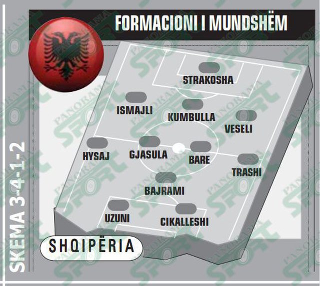 Ndërsa kur sulmon Shqipëria, rreshtimi pritet të transformohet 3- 4-3, ku Gjasula dhe Bare kanë kontrollin e qendrës së mesfushës, ndërsa Bajrami shikohet si një furnizues për dyshen sulmuese.