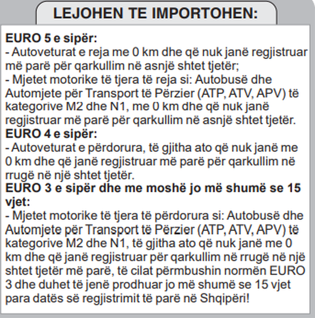 “Lejohet të importohen/regjistrohen mjetet EURO 5 e sipër: Autoveturat e reja me 0 km dhe që nuk janë regjistruar më parë për qarkullim në asnjë shtet tjetër; Mjetet motorike të tjera të reja si: autobusë dhe automjete për transport të përzier (ATP, ATV, APV) të kategorive M2 dhe N1, me 0 km dhe që nuk janë regjistruar më parë për qarkullim në asnjë shtet tjetër”.