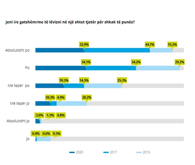 Një temë e nxehtë diskutimi në vendin tonë lidhet edhe me largimin e të rinjve nga vendi për shkak të punës. 86.3% e të rinjve do të ishin të gatshëm të zhvendoseshin në një shtet tjetër për shkak të punës. Vihet re një ulje e këtij trendi krahasuar me vitet e mëparshme, sidomos në rastin e atyre të cilët janë absolutisht të gatshëm për t’u zhvendosur.