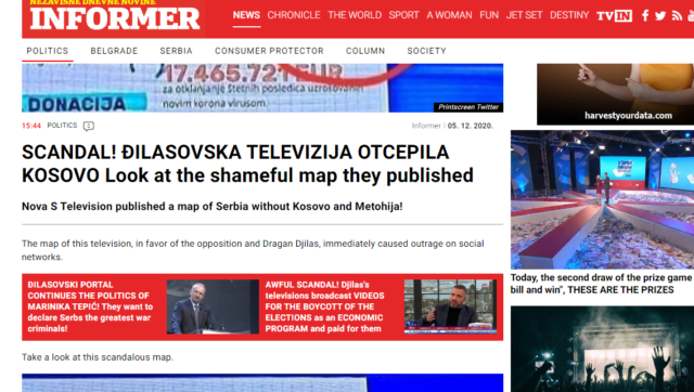 Televizioni serb “Nova S” gjatë transmetimit ka publikuar një hartë të shtetit serb, ku Kosova nuk është pjesë. Kjo ka shkaktuar reagime të shumta në Beograd, pasi një veprim i tillë nga mediumet e tjera të shkruara atje është cilësuar si “skandal”. Sipas raportimeve, ky televizion është përkrahës i opozitës në Serbi. Fotografia dhe raportimet në lidhje me këtë hartë të publikuar kanë bërë xhiro në rrjete sociale.