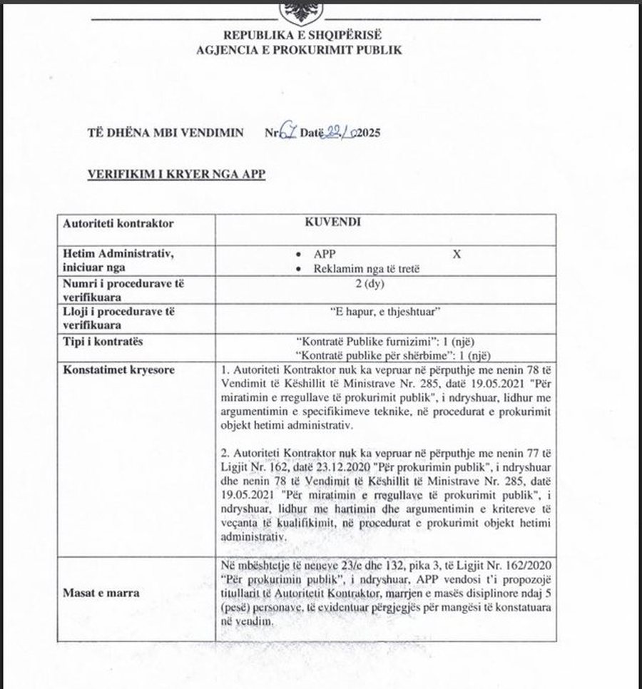 “Autoriteti kontraktor (Kuvendi) nuk ka vepruar në përputhje me nenin 78 të vendimit të Këshillit të Ministrave ‘për miratimin e rregullave të prokurimit publik’, i ndryshuar, lidhur me argumentimin e specifikimeve teknike, në procedurat e prokurimit objekt hetimi administrativ”, thotë Agjencia e Prokurimit Publik.