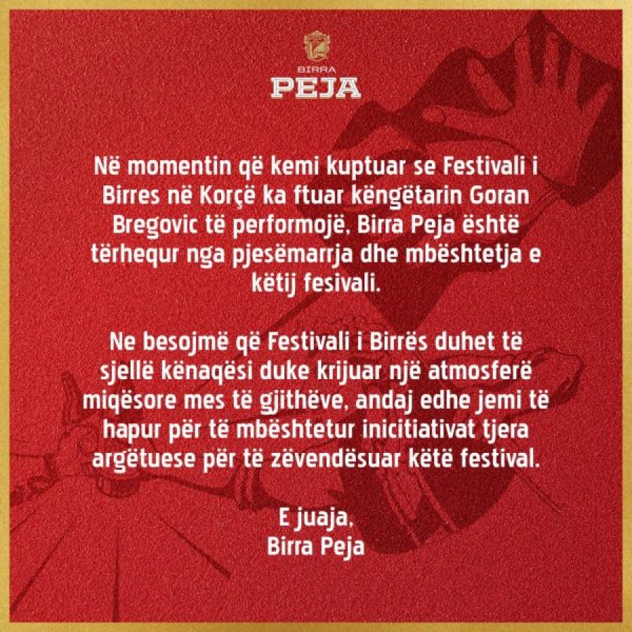 Birra Peja nuk do të jetë pjesë e Festivalit të Birrës në Korçë. Nëpërmjet një njoftimi, Birra Peja thotë se shkak i tërheqjes së mbështetjes së tyre për festivalin është këngëtari serb Goran Bregovic i cili është ftuar nga organizatorët.
