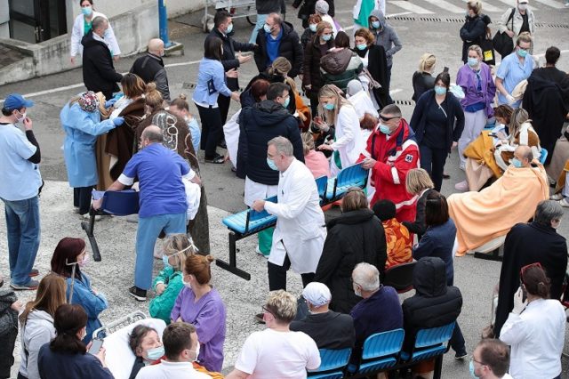 Pacientët dhe stafi mjekësor u mblodhën para Spitalit Holy Spirit pas tërmetit shkatërrues. Disa prej tyre qëndronin në barrela, ndërsa edhe një grup nënash me foshnja të mbuluara me batanije mund të shihen teksa qëndrojnë jashtë.