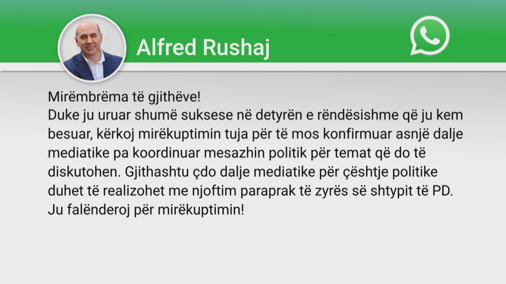 Mesazhi i Rushajt, i shpërndarë të martën pas orës 9 të darkës erdhi pas intervistës në News24 të sekretares për të përndjekurit politikë, Jonila Godole, ku bënte thirrje për distancim të PD-së nga Sali Berisha, i shpallur “non grata” nga SHBA.