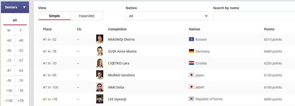 Xhudistja kosovare udhëheqë në renditje me 6510 pikë. E dyta është xhudistja gjermane, Anna Monta Olek me 6460 pikë.