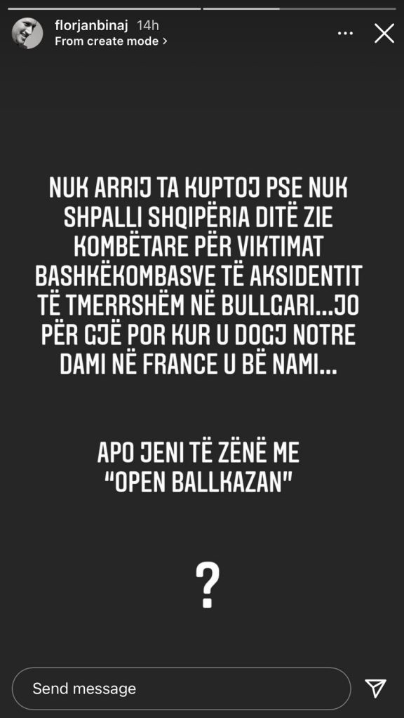 TIRANË– Maqedonia e Veriut, Kosova dhe Bullgaria shpallën ditën e djeshme ditë zie në nder të viktimave të tragjedisë së ndodhur një ditë më parë në Bullgari, ku humbën jetën 46 persona, pasi autobusi me të cilin po udhëtonin, u rrokullis dhe mori flakë. Shqipëria jo! Për këtë mosreagim të vendit ka pasur komente të shumta në rrjet. Mes tyre dhe aktori i humorit Florian Binaj i cili ka thënë: