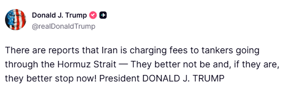 Presidenti amerikan, Donald Trump i ka lëshuar një paralajmërim Iranit pasi dëgjoi raporte se Teherani po u ngarkon tarifa cisternave që udhëtojnë nëpër Ngushticën e Hormuzit.